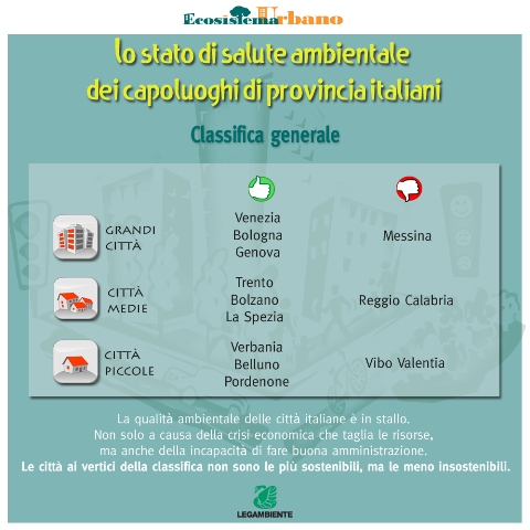 La ricerca di Legambiente, Ambiente Italia e Sole 24 Ore ha alla sua base decine di migliaia di numeri. Sono infatti oltre 100mila i dati che annualmente Legambiente richiede ai comuni capoluogo e che costituiscono l’ossatura del rapporto e consentono una fotografia dell’Italia delle città e una valutazione della qualità delle politiche messe in campo dagli amministratori pubblici.