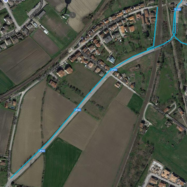 E’ identificabile come ciclopedonale sulla base del segnale verticale idoneo, scelta a mio avviso corretta vista la larghezza del percorso, anche se il segnale è chiaramente visibile solo nel tratto compreso tra l’incrocio con vicolo C. Forlanini, dove è presente anche un non necessario segnale di fine percorso (Chiarimento Ministero dei Trasporti Prot. 81669 del 14/10/2008), e l’incrocio con via C. Forlanini.