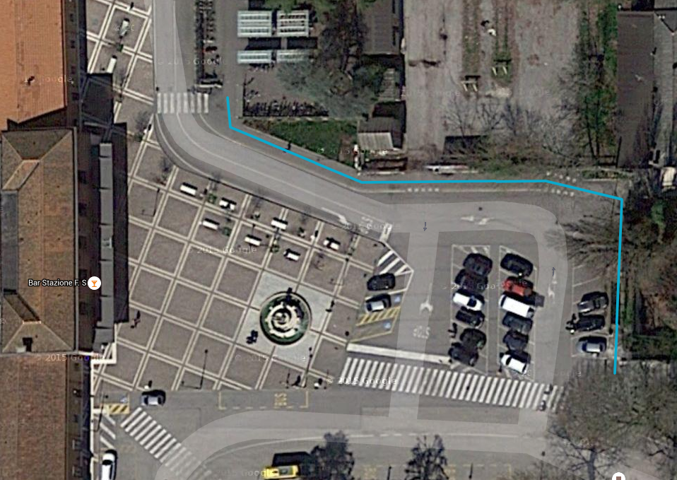 Descrizione: La ciclopedonale di piazza Riconoscenza si sovrappone ad un marciapiede che contorna il parcheggio antistante la piazza della stazione dei treni e poi prosegue su asfalto. Consente un collegamento ciclistico-pedonale tra via Guglielmo Marconi con il parcheggio per biciclette di fronte alla stazione dei treni.