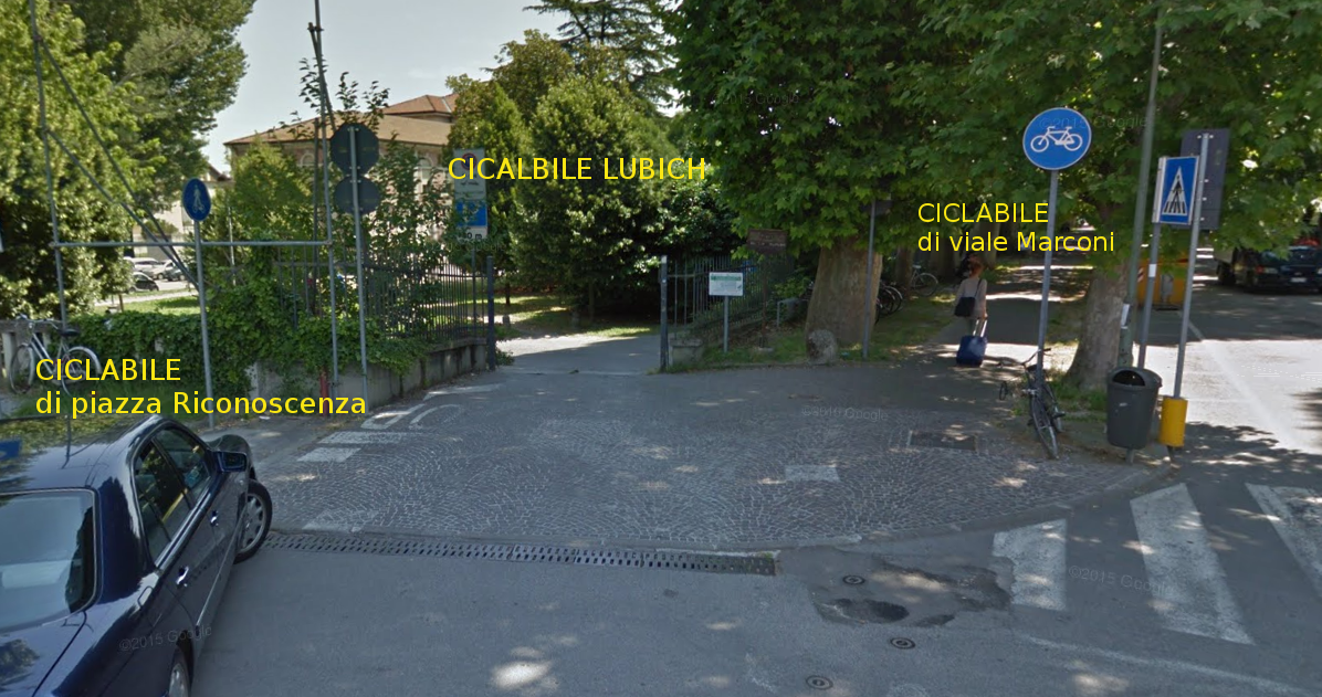 L’unica interpretazione che salverebbe questo percorso sta nel definire il percorso come “ibrido” ossia composto da due tratti uno ciclopedonale e uno ciclabile. Ossia è ciclopedonale nella parte che va da Viale Marconi al DLF mentre è ciclabile fino al parcheggio bici. Considerando la breve lunghezza, neanche 100 metri, non ci sembra opportuno fare tutta questa confusione. Infine il percorso è pure esposto al traffico veicolare anche se, poichè prossimo alla stazione, si muove a velocità contenuta.
