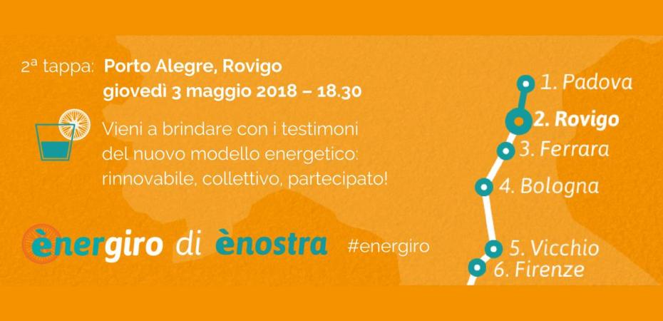 La comunità di ènostra attraversa l’Italia, in un viaggio gentile su due ruote, per incontrare i protagonisti del cambiamento e favorire la transizione energetica. Giovedì 3 maggio alle 18.30 vieni a conoscere Enostra presso la cooperativa Porto Alegre, Viale della Tecnica 10. Gli argomenti della serata saranno il nuovo modello energetico, la ciclabilità urbana e periurbana… e le comunità energetiche come ènostra!