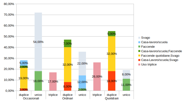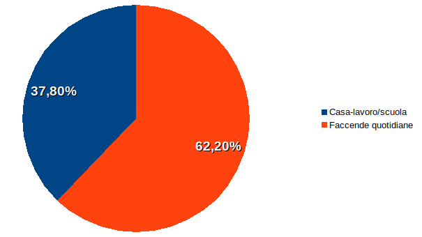 In questo primo grafico di sintesi vediamo una netta contrapposizione tra un uso quotidiano ed un uso per svago. Ma andando più nel dettaglio l’elemento del quotidiano si può distinguere in due grandi categorie: faccende quotidiane e percorso casa-lavoro/scuola. Che vedono una netta predominanza nell’uso in una ottica quotidiana legata alle faccende ordinarie (spesa, spazzatura, commissioni, ecc…).