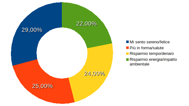 Qui il risultato è estremamente equilibrato nelle risposte (anche qui era possibile una risposta multipla, che abbiamo scorporato al fine di una uniformità statistica). Si ha una leggera prevalenza dell’aspetto emozionale nell’uso della bici (29%) ma nel complesso si può vedere una complessiva uniformità. Il dato fa emergere, a nostro avviso, come, gli utenti della bici, abbiano complessivamente un approccio a tutto tondo in relazione ai benefici derivanti dall’uso di questo mezzo.