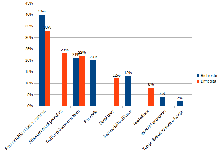 Emerge chiaramente che la maggiore difficoltà e quindi la maggior richiesta sia per una rete ciclabile chiara e continua. In secondo luogo tra le difficoltà più sentite troviamo quelle relative al rapporto con i veicoli a motore in particolar modo per quel che riguarda gli attraversamenti e l’intensità (nel senso di scarsa attenzione e velocità alla guida) del traffico automobilistico. In terzo luogo l’elemento di un maggior verde viene visto come elemento incentivante.