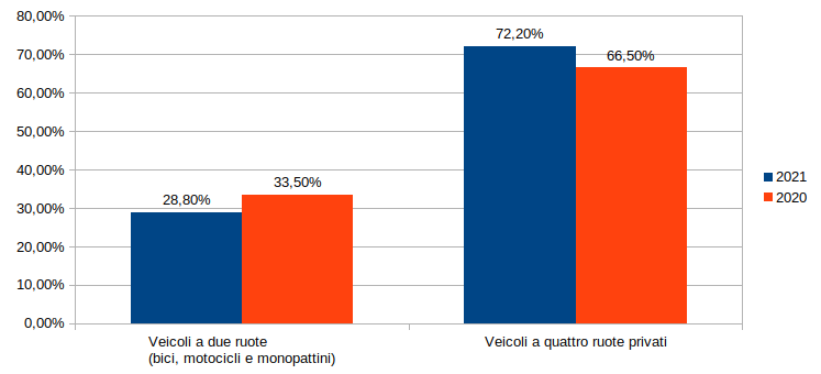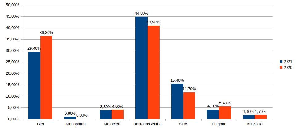 Purtroppo, dalle percentuali di veicoli in passaggio, appare evidente come ci sia stato un importante calo della presenza di biciclette (-6,9%, 496 nel 2020 e 434 nel 2021) in favore della mobilità motorizzata a quattro ruote (+3,9% di utilitarie/berline (558 nel 2020 e 661 nel 2021) e +3,7% di SUV (160 nel 2020 e 227 nel 2021)). Gli altri veicoli restano pressoché invariati con l’importante eccezione dei monopattini che da soli rappresentano quasi l’1% dei veicoli presenti (13 in totale) e che, fino al 2020, erano completamente assenti dalle statistiche.