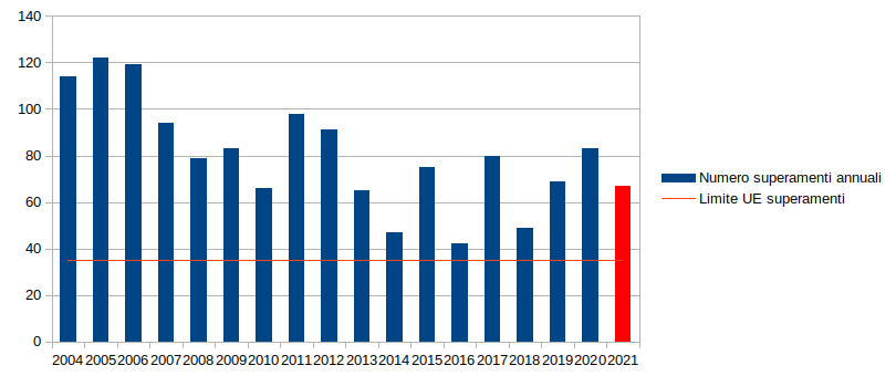 Certamente le condizioni atmosferiche della settimana sono state le ideali per il ristagno dell’aria e la prossima un po’ di vento dovrebbe mitigare la concentrazione. Eppure, anche quest’anno, non siamo riusciti a evitare di sfondare il limite massimo di superamenti (ad oggi 67 sui 35 concessi).