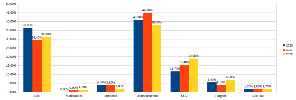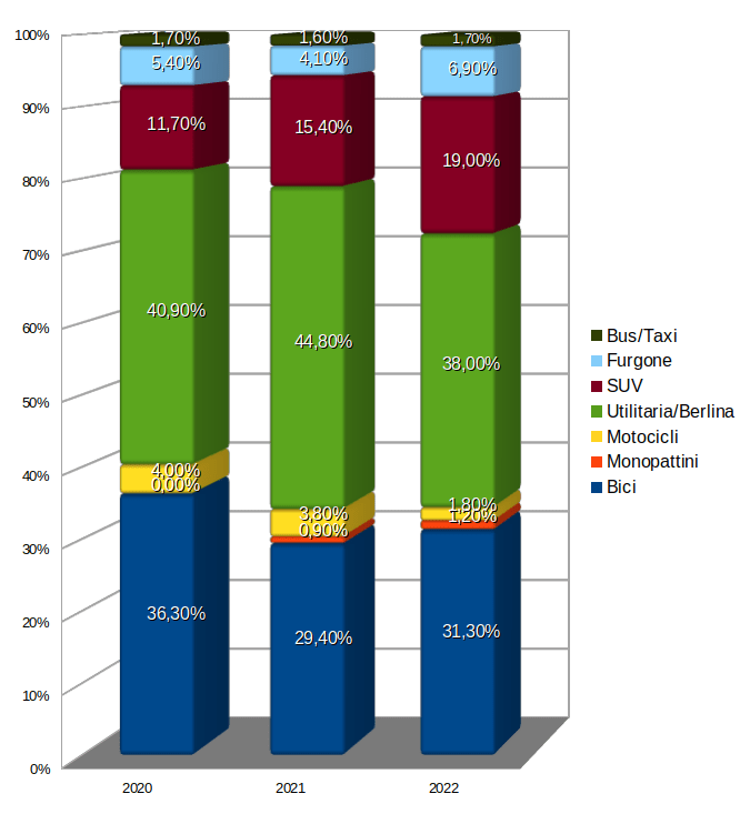 Dal lato dei mezzi a quattro ruote si nota un calo delle utilitarie/berline in favore di un costante aumento dei SUV, i quali dal 2020 hanno guadagnato un +8% di presenza sulle nostre strade.