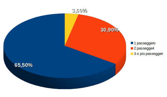 Approfondendo sulla qualità dell’uso dell’automobile appare chiaro un costante uso del mezzo esclusivamente per il trasporto di una sola persona. Ben il 65,5% delle auto di passaggio non trasportavano più del solo conducente. Uno spreco di spazio, una fonte facile di congestione e di consegunza una fonte primaria per la carenza di aree di sosta, tralasciando il tema dell’emissione di polveri sottili pro capite.