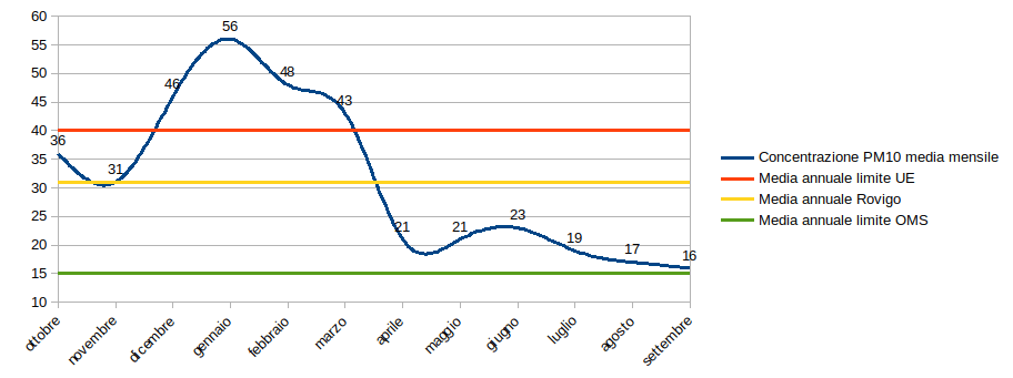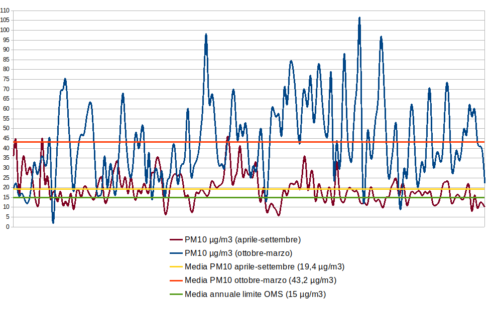 Prima di provare a trarre delle conclusioni, facciamo chiarezza su quali sono i limiti previsti per le Pm10 in Italia. La media annuale non deve superare la concentrazione di 40 µg/m3, ed è evidente che siamo abbastanza tranquillamente sotto questo limite (ovvero 31,3). Se, invece che alla normativa UE, facciamo riferimento alle linee guida dell’OMS il limite previsto è di solo 15 µg/m3 come media annuale. Un valore che non riusciamo a raggiungere neanche nei mesi più favorevoli e che invece doppiamo anche come media annuale.