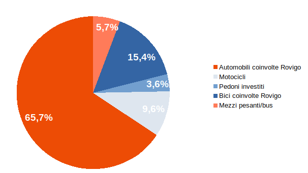 Analizzando, viceversa, le tipologie di veicoli coinvolti in sinistri abbiamo ben il 71,4% che sono stati causati da auto (65,7%) e mezzi pesanti (5,7%) viceversa gli utenti vulnerabili rappresentano solo il 28,6% principalmente rappresentati dai ciclisti (15,4%). Valori che, come abbiamo evidenziato sopra, restano stabili in proporzione da almeno un decennio. Si sottolinea inoltre che per quanto riguarda i decessi avvenuti nelle strade rodigine hanno coinvolto principalmente automobilisti ben 5 su 6 (un motociclista).