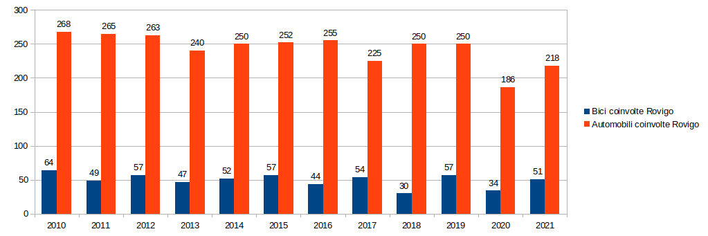 Restando nell’ambito del Comune di Rovigo, passiamo a dare uno sguardo alle tipologie di utenti coinvolti in sinistri. Non emerge una significativa riduzione per i ciclisti che, seppur con un buon dato (51 casi), resta piuttosto stabile negli anni. Più significativo il dato riguardante le automobili con un calo dei mezzi coinvolti di oltre 30 unità ma comunque sopra le 200 annuali. Si tratta, a ogni modo, di lievi cambiamenti, nella direzione giusta, ma pur sempre lievi.
