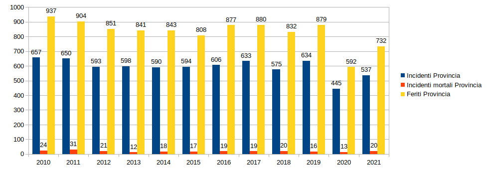 Da uno sguardo alla serie storica, emerge come l’incidentalità complessiva nella Provincia segni un piccolo calo (escludendo il 2020 segnata dalle limitazioni alla mobilità). Un calo non troppo significativo (537) ma il migliore dal 2010 con anche una conseguente importante riduzione dei feriti (oltre 100 in meno rispetto al 2019). Purtroppo la mortalità resta stabile, con quasi due morti sulla strada al mese (1,7) e oltre un sinistro al giorno (45 al mese).