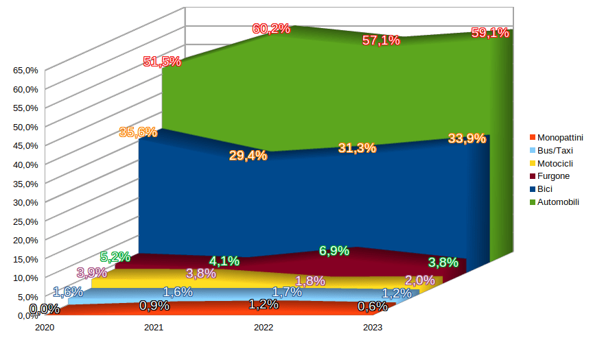 Entrando nel dettaglio possiamo vedere come l’automobile è il mezzo di trasporto preferito, coprendo quasi il 60% degli spostamenti. L’uso della bici è significativo (un valido 34%) ma tutto sommato stabile a conferma di due cose: